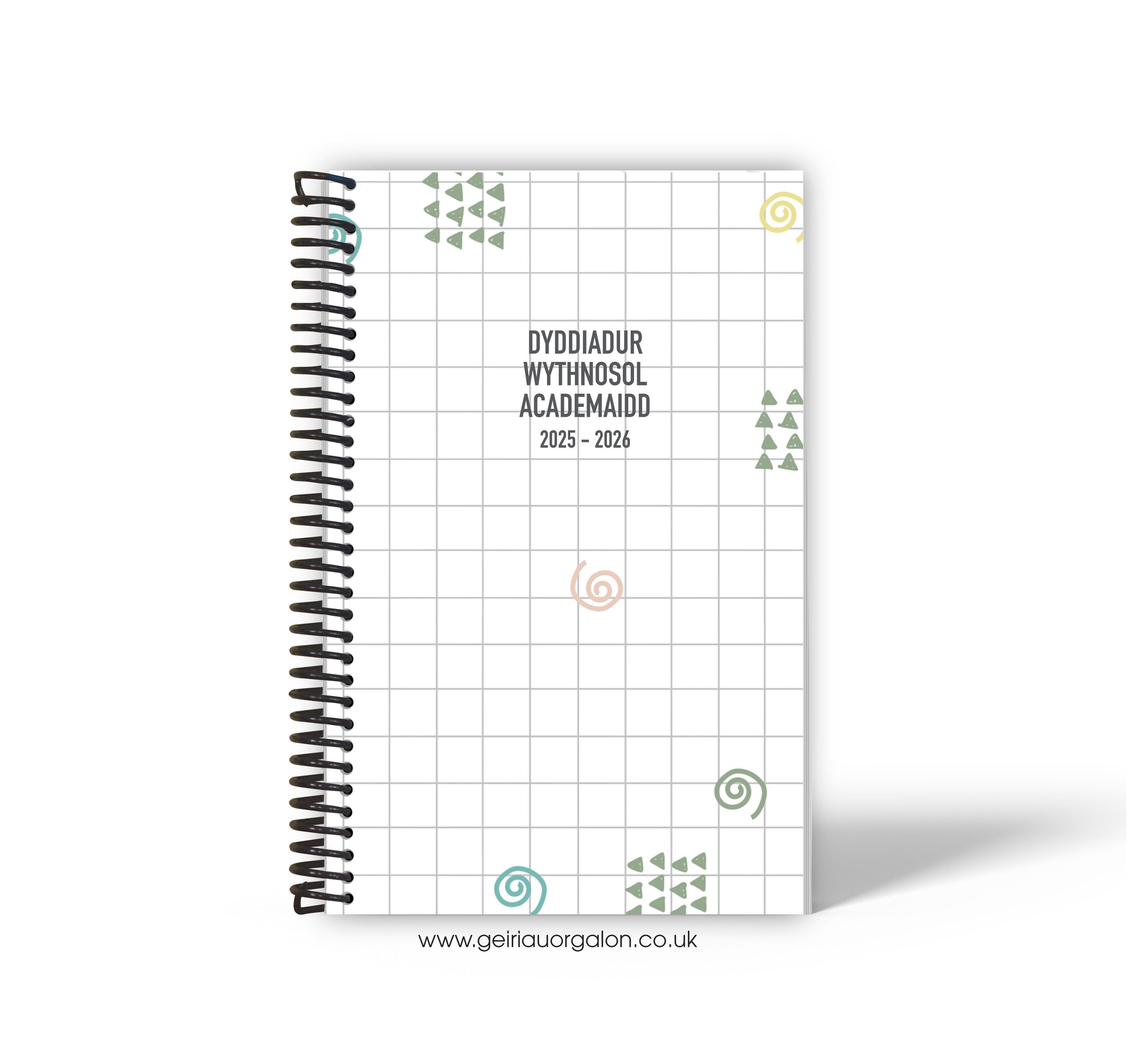 Our quality A4 Spiralbound Welsh Weekly Academic Diaries come with a variety of patterned front covers (NOT PERSONALISED). This isn’t just an academic diary – it’s a diary and notebook in one, thoughtfully divided into Autumn, Spring, and Summer terms with everything you need for your term organized in sections.