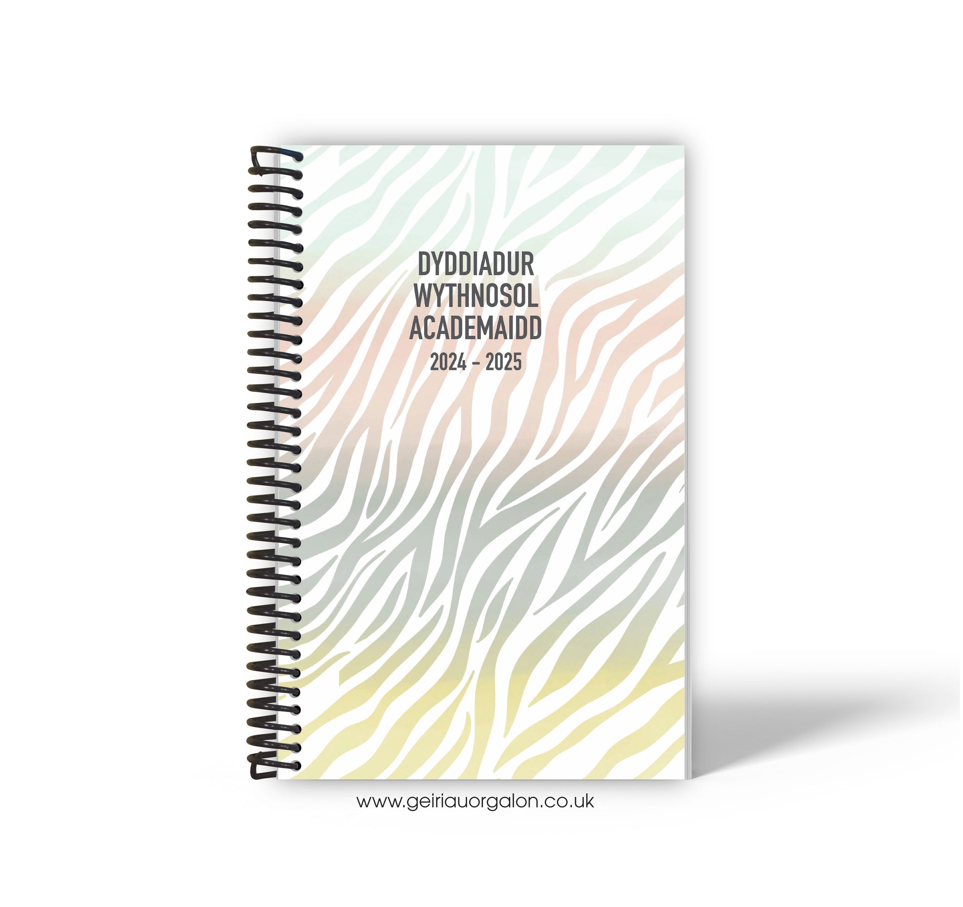 Our quality A4 Spiralbound Welsh Weekly Academic Diaries come with a variety of patterned front covers (NOT PERSONALISED). This isn’t just an academic diary – it’s a diary and notebook in one, thoughtfully divided into Autumn, Spring, and Summer terms with everything you need for your term organized in sections.