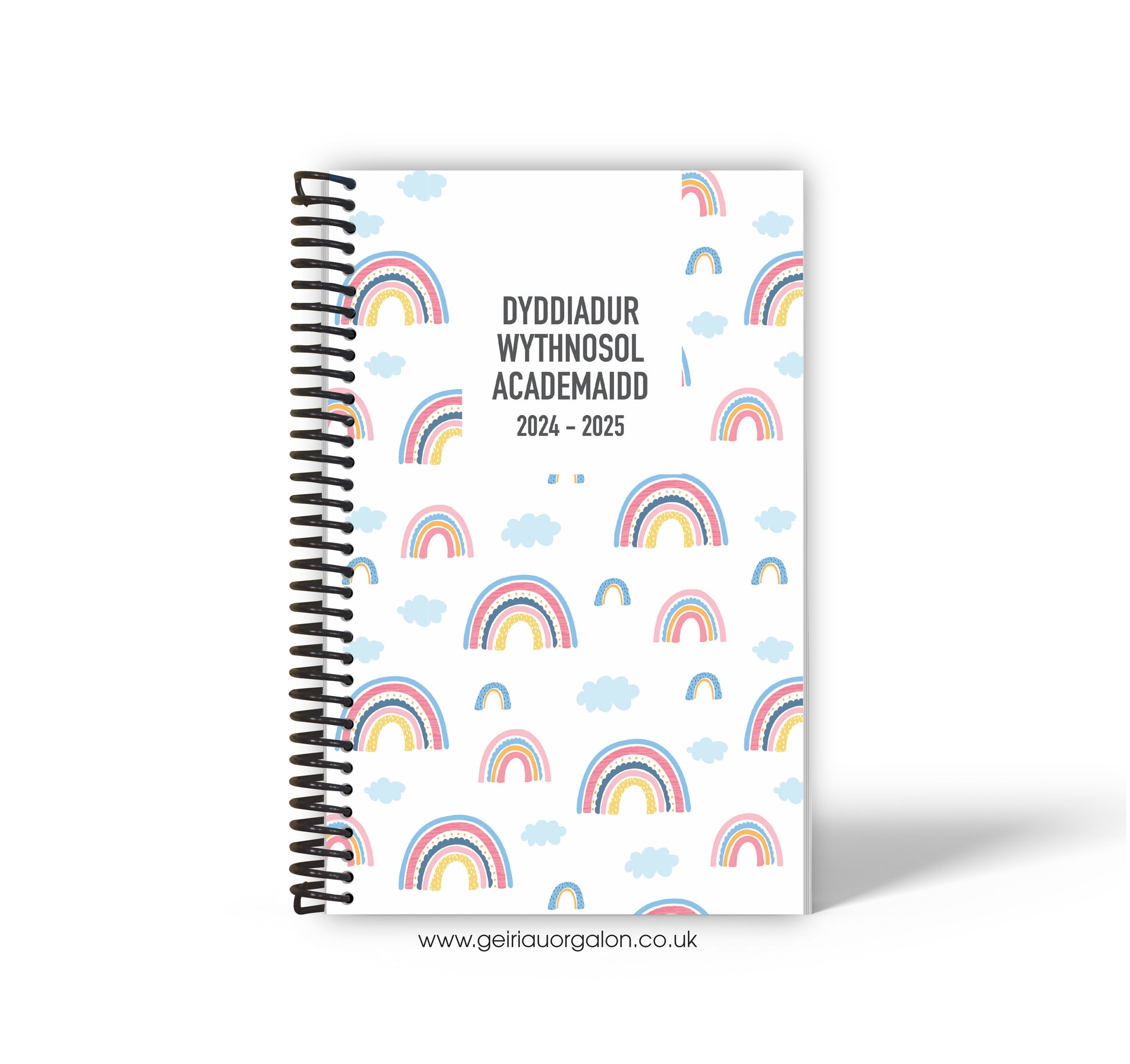 Our quality A4 Spiralbound Welsh Weekly Academic Diaries come with a variety of patterned front covers (NOT PERSONALISED). This isn’t just an academic diary – it’s a diary and notebook in one, thoughtfully divided into Autumn, Spring, and Summer terms with everything you need for your term organized in sections.